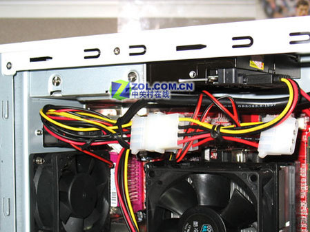 硬盘从机箱前部的支架搬到了普通机箱电源的位置,这样能够更有效地利用mini机箱内部紧张的空间。