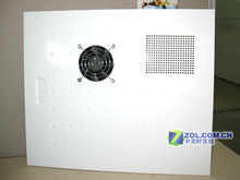 机箱左侧挡板上有38度机箱的标志性机箱风扇,在光驱的位置还开有散热孔,机箱中一部分的新鲜空气从这里进入,产生更好的风道,带走更多热量。右侧挡板电源位置开有散热孔为电源散热。