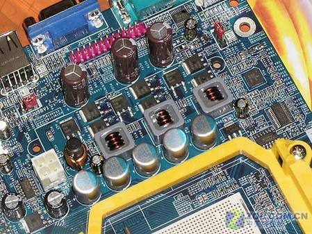 映泰TForce6100-AM2主板供电模块采用三相供电回路设计,搭配封闭式电感和大量高品质固体聚合物电容。