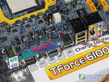 映泰TForce6100-AM2主板提供4个USB接口。板栽网络和集成声卡接口。由于是一款整合主板,提供显示VGA接口。