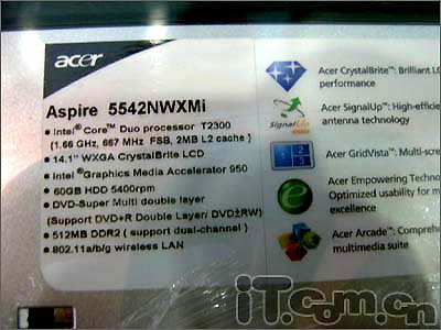 这款Acer 5542的配置参数或许您已经了解多次,但是为了更广泛的网友朋友小编还是要冗述一下!宏碁Aspire 5542NWXMi采用英特尔“酷睿”T2300双核处理器,主频1.66G,搭配256M内存和60G硬盘,14寸高亮宽屏显示器集成高性能显卡,内置DVD刻录光驱。由于Aspire 5542NWXMi省去了WindowsXP而采用了Linpus Linux BE系统,从而拥有更为出色的性价比,当然这也是这款本本价低的原因之一。扩展性上机器除了常用的USB 2.0、RJ-11、RJ-45、外接VGA等等接口以外,化繁为简让整体更美观。整机的重量是2.4KG,移动性尚可。
