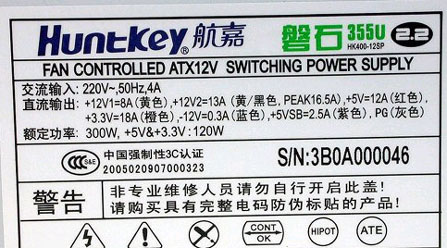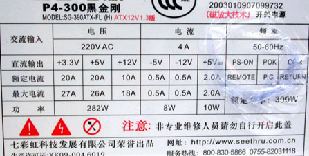 为了满足主流LGA775或K8平台使用,ATX2.0版本提供了一个24Pin电源接口,提供了双路+12V输出能力,为了确保PCI Express显卡带来的75W高功耗要求,同时还增加了一个6pin电源接口,如果你的电源为ATX1.3版本,在升级到LGA775或K8平台时,必须更换一台具备24Pin和6pin电源接口的ATX2.0电源。ATX2.0电源有250W、300W、350W以及400W四个版本,如果JS称自己的ATX2.0电源可以提供450W输出功率,那么我们需要考证一下它的真实性了,很有可能就是一款冒牌电源。