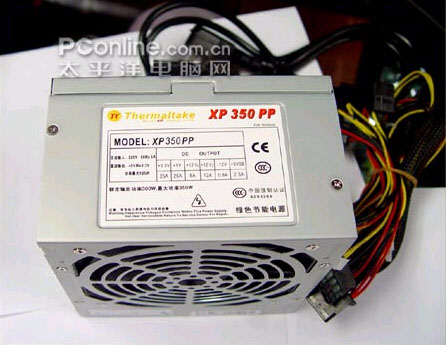 TT XP-350PP电源符合ATX12V 2.0规范,电源最大功率为350W,额定功率为300W,具备双路+12V输出,具有过压、过流、过载、短路四重保护功能,并通过了3C等多项安规认证,产品外壳采用了镀镍合金钢板材质,具有防辐射,防氧化特点。散热方面采用了大风车式设计,风扇尺寸为12CM,具有高风量、低转速、低噪音特点,同时提供了24 pin的主电源口、4 pin的辅助接口以及2个SATA设备接口、6个4pin D型接口、1个软驱型4pin接口,还附带24pin转20pin 电源转接线。