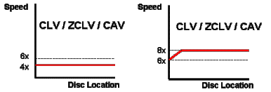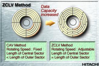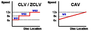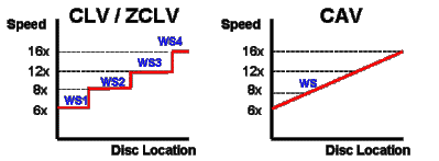 使用CAV的方式,盘片的转动速度保持恒定。因此,光头在外圈要比在内圈更快地获取数据。使用CLV的方式,获取数据的速度保持恒定。因此,盘片在外圈必须降低其转动速度。ZCLV则是将CAV的概念引入到CLV中。但是,这仍是一种CLV的方式。唯一的区别是,盘片上的轨道被分段为各个“区域”,使盘片在不同的区域间保持相同的转动速度。