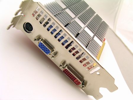 另外显卡的接口部分采用的双卡位设计,其中一个空卡位上布满了散热孔,有利于机箱内空气流通降低温度。这款显卡采用全接口的输出方式:VGA+TV-OUT+DVI的组合。