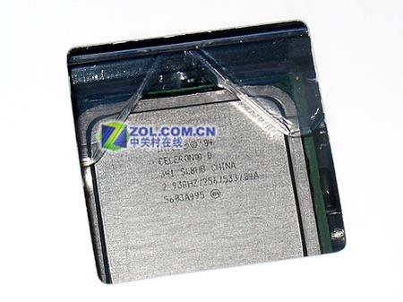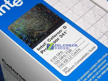 产品采用加装金属顶盖设计,在保护核心的同时也增大了散热效果。从产品编号区可以看到标注有CELERON D 341,编号为SL8HB,产地为CHINA(中国)。其次为2.93GHZ/256/533/04A,编号为5603A495。