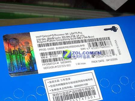 产品包装上的规格标签提示有:主频为2.93GHz,前端总线为533MHz,L2级缓存容量为256KB。