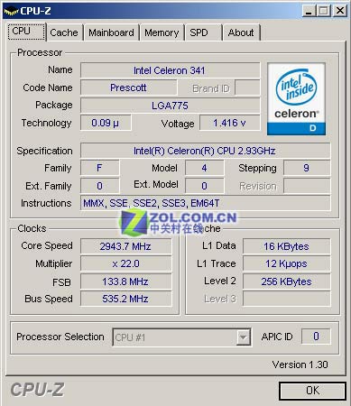 从CPU-Z信息中可以看出,Celeron D 341处理器采用Prescott核心,制程工艺为90纳米,实际工作电压为1.416,Family模式为F49,支持MMX、SSE、SSE2、SSE3、EM64T指令集。实际主频为2943.7MHZ,倍频为22,外频为133MHZ,前端总线为535.2MHZ,L1 Data为16KBYTES,L1 Trace为12KUOPS,L2级缓存容量为256KB。Intel在Celeron D处理器中没有加入超线程(HT)功能,不过其它Prescott核心的特性都有所保留,典型的超长31级流水线、改进过的分支预测结构和调度,性能表现更加出色。产品工作电压为1.4V、生产日期为2006年4月12日,产地为中国。