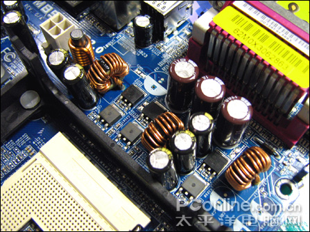 主板供电电路采用了三相供电设计,采用了Nippon Chemi-con的KZG系列电容和Panasonic的直插式电容,每相1:1的MOSFET配置。