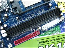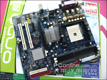 N61G采用昂达惯用的藏蓝色PCB,小板设计,适合安装在小机箱里面。主板上的北桥/南桥芯片都搭配上了散热片协助散热。新版本的昂达N61G采用的是nVIDIA NF6100+NF410芯片组,支持AMD Scoket754 64位速龙和32位/64位闪龙处理器。GF6100芯片(C51G芯片)整合了NV44图形芯片,新版本的核心频率已经升级了475MHz。