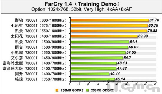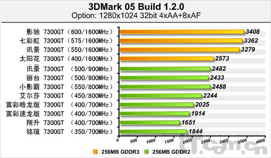 由于成本原因,大部分厂商在推广千元显卡时候都只是使用大容量DDR2显存,并且价格跟128M的GDDR3显存看齐,导致大量消费者在选择时候无从下手。从以上数据可以看到,同为256M显存,DDR2显存的速度比DDR3显存的速度慢了接近一半,DDR3高频优势显露无疑!