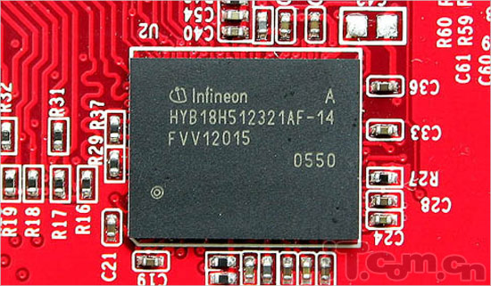 显存方面使用了著名内存品牌英飞凌的136PIN GDDR3,完全符合欧洲环保标准。速度为顶级1.4ns,4颗显存组成128BIT显存位宽,容量为256M,是第一款配备256M DDR3但售价仅为699元的RadeonX1600显卡。1.4ns显存标准频率为1400MHZ,而铭?把它的默认频率设定为1380MHZ。根据经验,英飞凌这种显存普遍都能稳定运行在1600MHZ左右,手动能力强的玩家不妨再挖掘潜力,说不定会有意外收获。