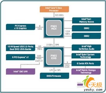 同时具备硬件Pixel Sader 3.0和Vertex Shader 3.0处理能力,硬件T&L处理、精确浮点运算并支持HDR效果,最高可共享256MB系统内存。Q965定位于企业级,它同样是一款整合芯片组。Q965规格依然非常强大,它支持1066/800/533MHZ前端总线,支持双通道DDR2 800/667/533内存。特点是在不使用独立显卡情况下能够支持双屏显示,具备DVI和VGA双显示接口。INTEL并为其量身定做了ICH8DO南桥芯片,DO版本ICH8南桥具备Digital Office(数字办公)功能。Q963是Broadwater家族中最低端的产品,整合图形核心,芯片预计售价38美元,可见其主攻的是低端市场。在内存方面最高仅支持双通道DDR2 667规格,在不超频的情况能满足1066MHZ前端总线处理器的带宽需求。