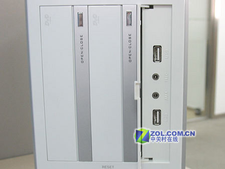 面板的设计让人眼前一亮,乳白色给人干净大方的感觉。USB,音频前置接口藏在光驱的旁边。