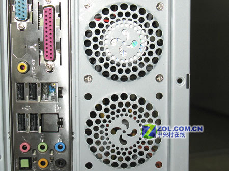 机箱后部由于空间有限只能使用小尺寸的散热风扇,但是数量增加为两个,以数量弥补风量的不足。