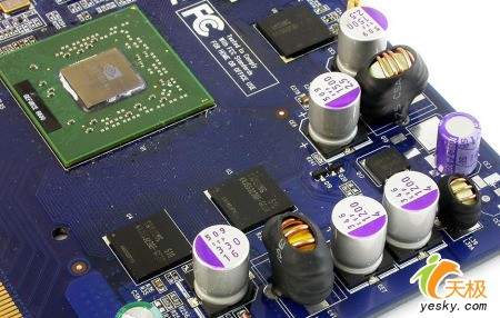 影驰6600GE AGP版做工比较精细讲究,从板身来看,该卡的布局相当简洁,用料方面则大量采用SANYO OSCON系列固体聚合物高档电容,完全体现了一线显卡大厂精巧的作风。