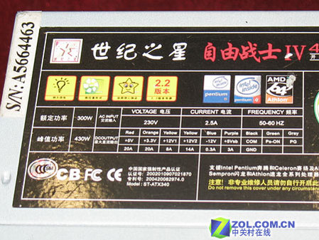 从自由战士4的铭牌上不难看出它是一款符合Intel ATX 12V 2.2版本规格的额定300W电源,峰值功率更是达到了430W。其铭牌上的参数标示清晰详细,体现出世纪之星一丝不苟的作风。