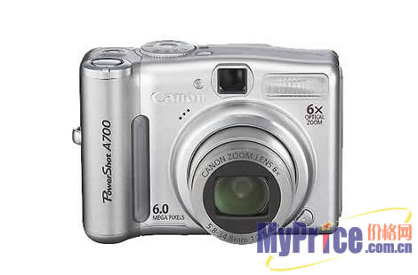 佳能PowerShot A700采用了1/2.5英寸600万有效像素CCD,最大可拍摄2816×2112像素的图片,6倍光学变焦镜头,折合35mm相机焦距为35~210mm,4倍数码变焦能力,最大光圈为F2.8~4.8,支持光圈优先、快门优先和全手动曝光操作,快门速度为15~1/2000秒,最高ISO达800。