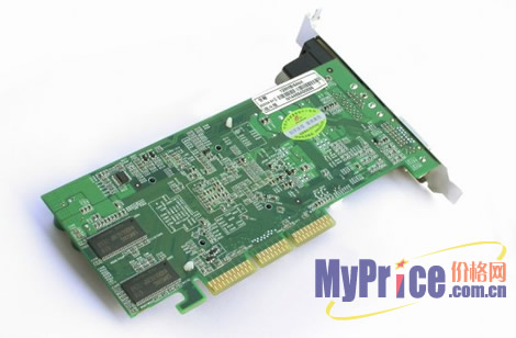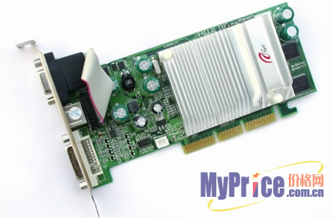 翔升这款显卡采用了自主研发的绿色PCB窄板设计,做工精密,布局合理。巨大的散热片占去近1/3的面积,由于显示核心的发热量并不大,所以采用了被动散热方式的散热片。不过,在卡上还预留了风扇电源接口,玩家可以在超频后自己安装风扇散热。