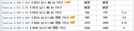 看来上表,你一定会发现目前散装PD 805比盒装低大约50元左右,也就是说它的售价现在仅为八百元左右,按照目前的趋势,跌破八百只是时间问题。如此一来双核处理器的价格门槛再次降低,我们完全可以猜想是否用不到千元就能搞定双核处理器+主板呢?