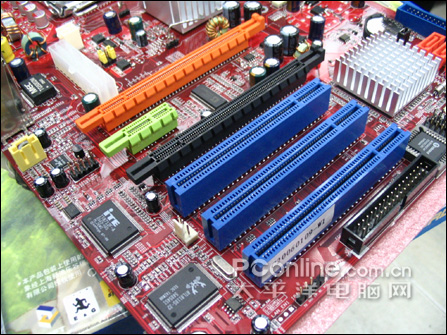 主板的双插槽部分,设计了复杂的PCI-E x16供电电路,重点优化了高功耗显示卡的支持。使3D环境整机工作更加稳定Intel目前已经得到了ATI的授权,所以支持Crossfire技术不在话下。而且这块主板还通过破解的方法,能够支持SLI。主板采用了免跳线设计,单双卡切换不用任何跳线和Bios调整。。值得注意的是,由于945PL原本就不支持双显卡,所以这块主板只能支持16x+4x模式。除了PCI-E显卡外,它还提供了一个PCI-E X1和3条传统的PCI插槽。