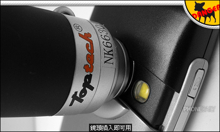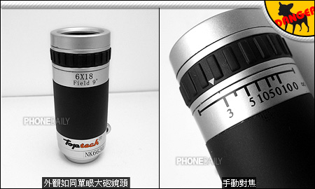 由 Brando Workshop 代理的 Toptech手机望远镜,其设计像极了单反相机的大炮镜头,利用附赠的特别机壳装在手机镜头前,立即让相机具备6倍光学变焦能力。像我们这次测试的手机 Nokia 6680,本身已有6倍数字变焦,加上望远镜后即可飙高到36倍的放大效果。现在,体积更小的偷拍工具已经正式诞生,演艺圈的明星将面临新一波「全民狗仔队」恐慌。