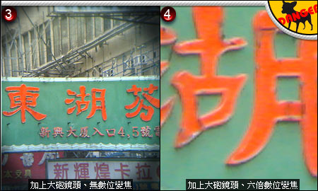 3. 只要接上大炮望远镜后,立即把景物放大 6 倍,视野下的招牌十分清晰。不过图片四周却看到清楚的边角失光,可见望远镜的成像圈尚无法与相机的广角端完美配合。解决办法是启动手机的数字变焦并稍作拉近,外围的黑圈即可消失。