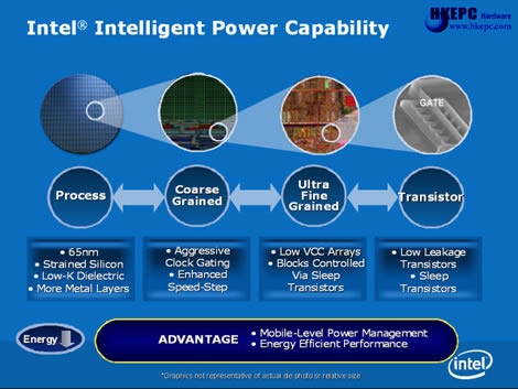 由于上代Prescott处理器功耗表现并未如理想,故新一代Core架构针对功耗上作出重良的改善称为Intel Intelligent Power Capability技术,处理器在制程技术作出优化,例如采用先进的65奈米Strained Silicon技术、加入Low-K Dielectric物质及增加金属层,相比上代90奈米制程减少漏电情况达1千倍。但最值得注意的是,Intel加入了细微的逻辑控制机能独立开关各运算单元,只有需要时才会被开启,避免闲置时出现不必要的功耗浪费,称为Sleep Transistors技术,此外,把核心各个Buses及Array采用独立控制其VCC电压,当这些部份被闲置时会被运作于低功耗模式中。