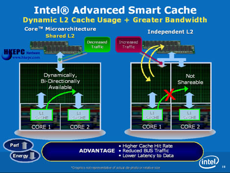 Smart Cache架构还有很多不同的好处,例如当两颗核心工作量不平均时,如果独立L2 Cache的双核心架构有机会出现其中一颗核心工作量过少,L2 Cache没有被有效地应用,但另一颗核心的L2 Cache却因工作量过重,L2 Cache容量没法应付而需要传取系统记忆体,值得注意的是它并无法借用另一颗核心的L2 Cache空间,但SmartCache因L2 Cache是共用的而没有这个问题。