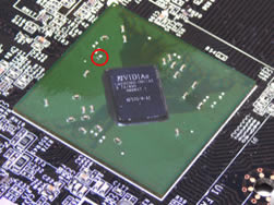由于Magic-Pro A2N5并没有给予我们足够的启示,因此我们唯有真接嗽至的修改MSI K9N Platinum (nForce 570),采用K9N Platinum的主要原,是它的PCB设计与支援SLi的K9N SLi Platinum是共用的(MS-7250),因此Magic-Pro A2N5能以nForce 550达成SLi,那么MSI K9N Platinum也应该是100%可成功的,另一个原因是我们手上更有K9N SLi Platinum (nForce 570 SLi)方面对照,但无可否认的是我们编辑部就只有这一片不支援SLi的nForce 570,别无它选(笑)。我们把红圈那颗贴片电容从MCP55晶片上拿掉,并兴奋地拿去作测试,结果.................