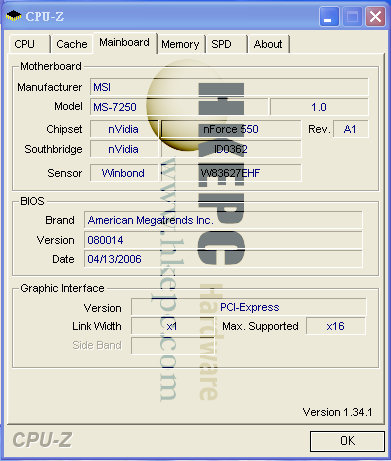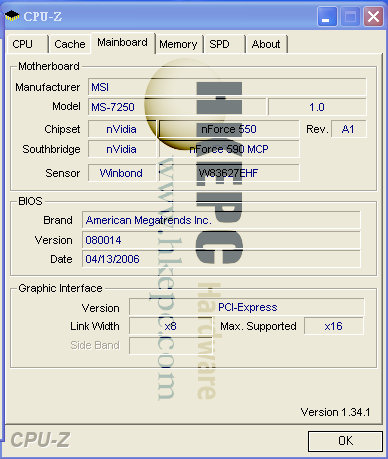 虽然并不能成功令MSI K9N Platinum侦出第二组PCI-E x8绘图接口,但透过CPU-Z软件我们知道已成功把被屏敝的SLi功能重开了,在CPU-Z的主机板绘图接口资料一栏,由原本Link Width X1 Max X16,变成为Link Width X8 Max 16,效果和Magic-Pro A2N5相同,因此我们相信余下的问题是主机板本身而并非MCP55晶片,因此我们必需要拿MSI K9N SLi Platinum对照,才能找出破解之谜。