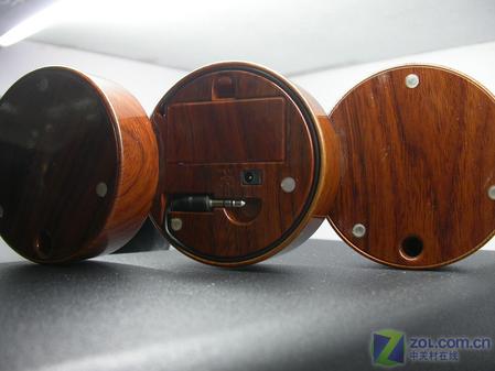 值得一提的是这款小音箱还采用多种供电模式。可以安装电池,也可以选用电源适配器和USB电源线。背面有个凹槽,可以把音频信号输入插头“藏”起来,小巧方便。