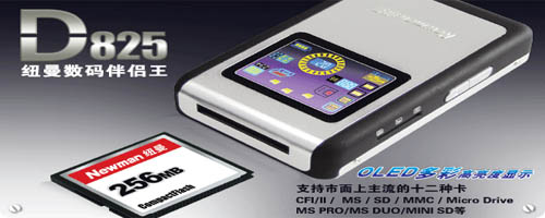 D825支持市面上的主流13种存储卡,包括CF、MicroDrive、Magicstor微硬盘 、SD、MMC 、MINI SD、 MS、MS Pro、MS Duo、MS ProDuo等。对于拥有手机存储卡的用户来说,不外乎是一个很好的选择,您可以随时将手机即兴拍摄照片传输到数码伴侣中保存。当然,D825更适合记者、摄影爱好者、商务人士的选择。80G容量的才1260元,购买可以咨询移动存储网店(电话:010-82615035)。
