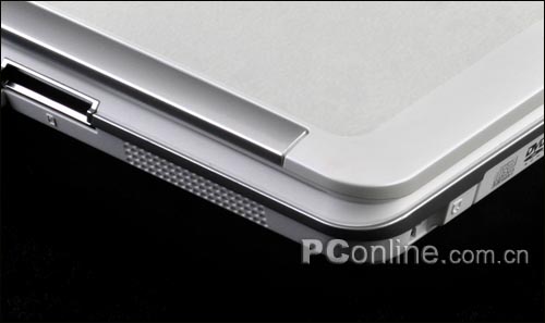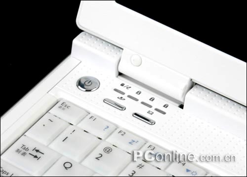 这款笔记本将电源按钮、快捷键和指示灯都集中在了键盘的左上方。所采用的灯光皆为时尚的蓝色,配以白色的周边衬托显得相当的高贵。快捷键的设置上,并没有预留自定义快捷键,仅提供IE、Outlook两个快捷键。不但快捷键做得精简,指示灯也如此,硬盘与光驱仅由一盏指示灯显示状态。如此的设计想必是为了美观与整体风格而作出的牺牲。