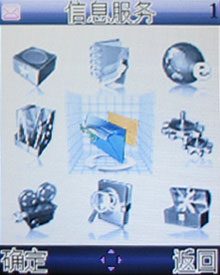 联想V800采用了传统的九宫格菜单,菜单风格和之前上市的“超人手机”I750类似,除了目前所在功能的图标是彩色动画显示,其他图标都是灰度显示,虽然看起来有些暗,但是却比较直观,用户还可以选择深海兰、科技灰、梦幻紫三种风格。