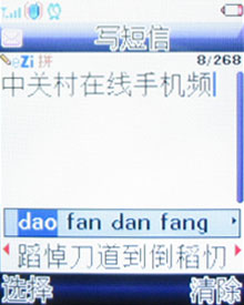 不过该机的短信存储能力达到了800条,这也可以看出这款手机主要还是面向年轻时尚的“短信一族”。该机的短信功能也是非常全面丰富的,每条短信可以一次性输入268个汉字,并且可以按群组发送或者自定义多方发送。输入法方面,包括eZi拼音、eZi英文、笔划、英文大/小写和数字输入法,使用“#”键可以切换,“*”键可以调出标点符号,方便易用。