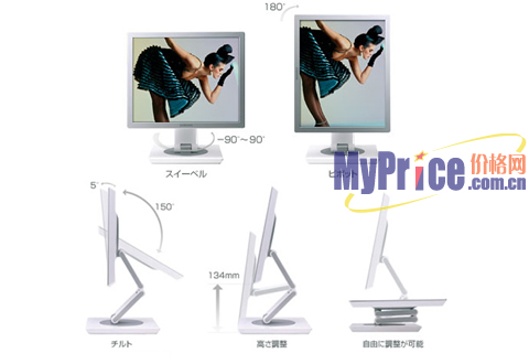 三星 970P的支架设计已经突破了前作193P,970P在颈部增加了一个转轴,而且970P的底座也是可以旋转的。970P可以在-5~150度之间进行调整,而屏幕也可以进行-90~90度的调节,可变幅度则为134mm。同时,970P在屏幕旋转时,液晶显示器内的传感器会通过DDC/CI发送信号到电脑上,通过安装对应软件MagicRotation,自动地转画面的表示内容。转弯角度最大为180度。当然,显卡必须要支持DDC/CI功能。