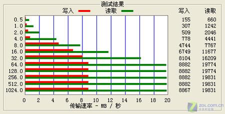 笔者使用ATTO Disk Benchmark对威刚 PD7进行了测试读写速度。该软件在测试中使用一定的数据量(64KB-32MB可选,默认为4MB),按0.5KB、1.0KB、2.0KB直到1024KB的文件块大小进行分别读写测试(总数据量恒定),测试完成后的数据会用柱状图形象地表达出来,直观地显示了文件大小比例不同对速度的影响和存储卡读写速度的差别。