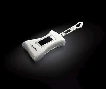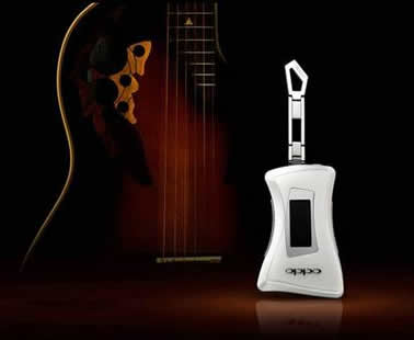 OPPO X31M的机体造型俨然一把袖珍版本的电吉他。吉他的的琴箱部分正面采用了半透明珍珠材质,背面是经过磨砂处理的金属材质打造,产品各部分之间密合极佳,不负OPPO一贯做工精细之名。这款产品尺寸为57.4mm×36.5mm×12.5mm,重23.1克,非常的轻巧。