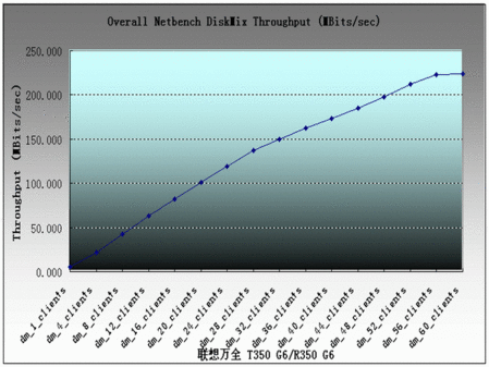 我们启用了60个客户端,运行标准Disk Mix测试(DM.TST),联想万全T350 G6/R350 G6服务器的最高吞吐量为223.96Mb/s,通过观察曲线我们可以看到,随着客户端的数量的增长对于吞吐量的表现影响比较小,仅在56客户端时,曲线有所趋缓,而到了60个客户端连接时吞吐量数值达到了顶峰。