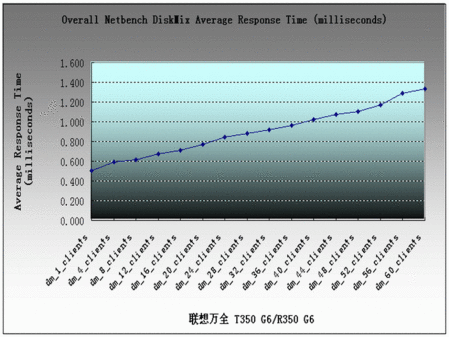 在响应时间方面,联想万全T350 G6/R350 G6服务器的最高平均响应时间为1.334ms。在测试过程中,响应延迟曲线一直处于小幅攀升的状态。在此方面,联想这台服务器的表现继承了英特尔平台的传统,与采用AMD双核皓龙系统相比,尤其在响应延迟不能不说是个“软肋”,具体差异,有兴趣的读者可以浏览我们之前进行的评测。