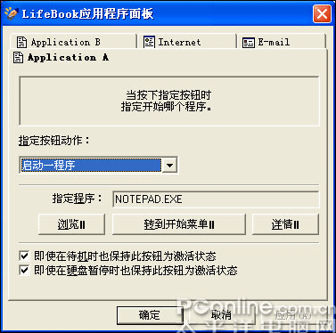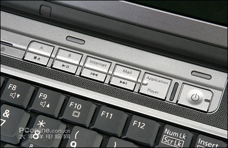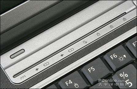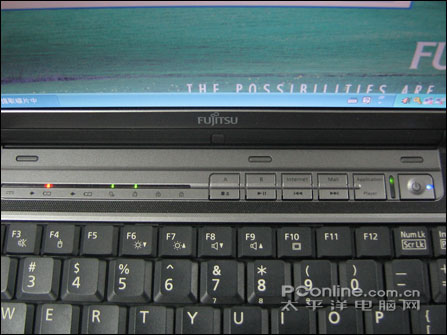 富士通S6311的快捷键及指示灯都集成在一块面板上,极具金属味道。最右边的按键就不用说了吧?当然是电源键了,并在按键旁边集成了一个指示灯,电源启动的时候亮起幽蓝色的灯光,魅力十足;往左是应用程序(Application)和播放器(Player)切换键,在旁边也配了一个黄绿色灯光的指示灯,当应用程序档激活时,靠近上方的指示灯亮,反之,当媒体播放激活时,下方的指示灯亮。