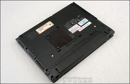 S6311的背部显得异常平整,设计也显得非常严谨,一丝不苟,但是背部很少进风口,只在靠近前端的地方有一个。四个边角的橡皮垫也起到了防滑作用,另外在内存位置覆盖了一层皮质的材料,具有非常舒服的手感,这种设计只有在富士通的笔记本电脑上看到,主要起到隔热的作用。S6311的进风口基本上是设计在机身两侧和前端,并且是侧面偏下的位置,这样避免了将进风口设计在底部带来诸多隐患和散热不理想。整机大量采用金属材质,因此为良好的机身温度控制打下来坚实的基础。硬盘被放置在一个带有许多孔状的金属盒子里面,不光能起到很好的屏蔽作用,而且能及时将硬盘的热量散发出去。