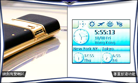 Vertu Constellation 系列手机支持 GSM 四频接收,贯串全世界 180 多个国家,最特别的是加入实时航班追踪功能,能为候机楼或往返机场路上的用户提供航班最新信息;至于实时外汇换算功能,可在任何时候为用户提供准确的外汇信息;而全球时钟功能可以提示本国及旅途所在地的时间,并可同时显示三地时间。为了使旅程更加完美,Vertu Constellation 系列手机还提供了全球天气信息,让您准确地了解目的地的天气状况。