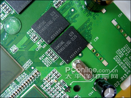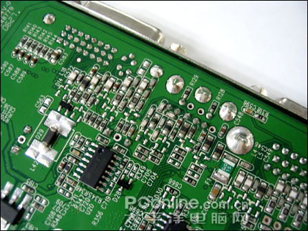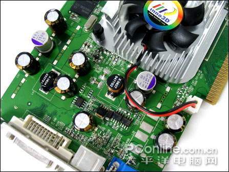 供电部分使用了三洋SVP固态贴片电容与直插式电解电容组合的方式,核心显存分离式供电,用料比公版7600GS PCI-E还要足!