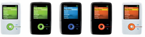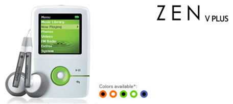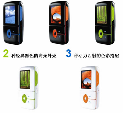 ZEN V Plus 采用黑白2种经典颜色的高光外壳,配合3钟活力四射的明快色彩进行搭配:形成白色与橙色、白色与绿色,黑色与橙色、黑色与绿色、黑色与蓝色 五种配色方案,并且它们分别代表了1GB、2GB和4GB的不同容量。