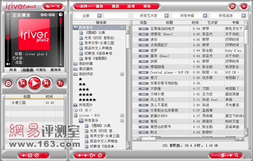 E10的音乐管理很强大,它可以自动读取MP3文件的ID信息,可以按照歌曲的作者、专辑、流派等等信息自动归类检索。不过,为了建立检索信息,用户需要使用iRiver Plus 2上传歌曲文件。其操作是很简单的,先将音乐文件导入媒体库“所有音乐”项目下,然后点击右下角的箭头符号,文件即可自动上传。用户也可以选择打开自动更新功能,这样,每当E10连接电脑后,Plus2会自动同步PC机上的媒体库到E10播放器上。