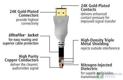 首先让我们来了解一下什么是HDMI。HDMI的英文全称是“High Definition Multimedia”,中文的意思是高清晰度多媒体接口。HDMI接口可以提供高达5Gbps的数据传输带宽,可以传送无压缩的音频信号及高分辨率视频信号。同时无需在信号传送前进行数/模或者模/数转换,可以保证最高质量的影音信号传送。HDMI在针脚上和DVI兼容,只是采用了不同的封装。与DVI相比,HDMI可以传输数字音频信号,并增加了对HDCP的支持,同时提供了更好的DDC可选功能。HDMI支持5Gbps的数据传输率,最远可传输15米,足以应付一个1080p的视频和一个8声道的音频信号。而因为一个1080P的视频和一个8声道的音频信号需求少于4GB/s,因此HDMI还有很大余量。这允许它可以用一个电缆分别连接DVD播放器,接收器和PRR。此外HDMI支持EDID,DDC2B,因此具有HDMI的设备具有“即插即用”的特点,信号源和显示设备之间会自动进行“协商”,自动选择最合适的视频/音频格式。