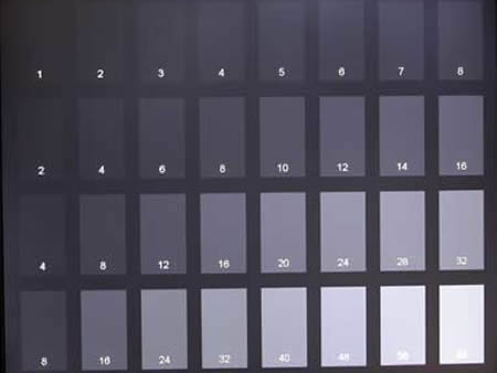 把亮度和对比度调至最高,可以毫不费力的看到1、2灰格。能见到的灰格越多,这表示显示器的灰度越好。灰度好的显示器在实际使用当中,图象的层次感丰富,色彩过渡自然。