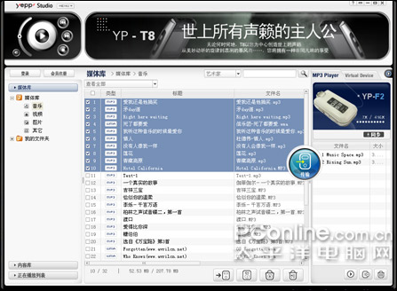 F2随机光碟里配有三星著名的“Yepp Studio”音乐管理软件,该软件功能强大,可以扫描归类PC中的所有音乐文件,可以同步PC与播放器之间的文件,可以建立播放列表,可以编写和搜索歌词,同时,该软件还集成了音乐播放器和音频格式转换器等功能,实用且好用。另外,该软件还能够直接显示三星官方网站,可以登陆到三星的资源平台,以获得更多对学习有用的资料。